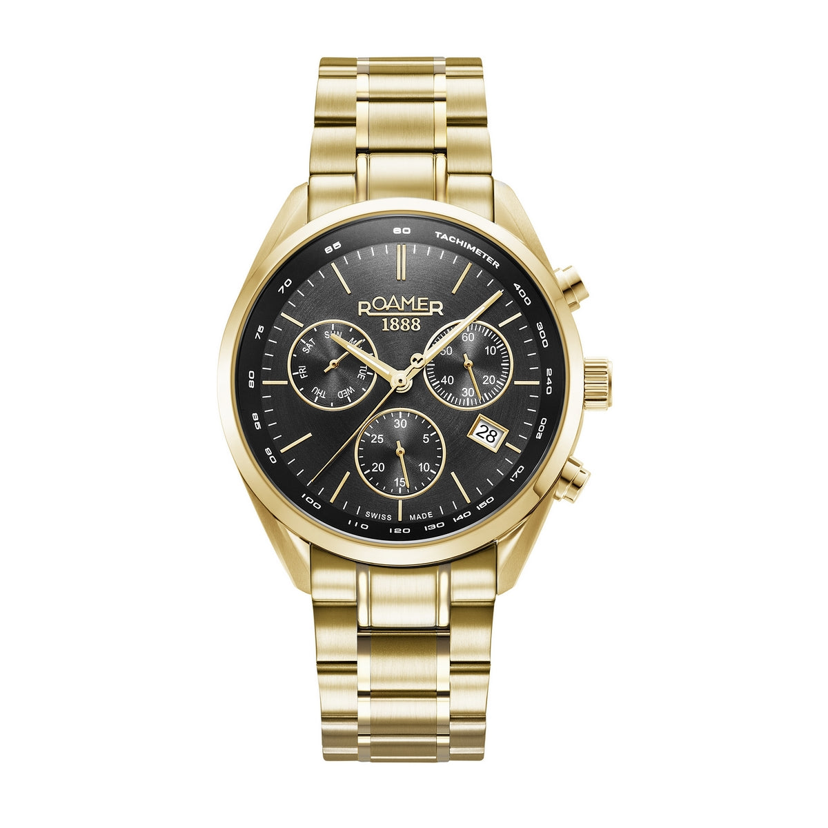 roamer pro chronograph gents gold plated black dial bracelet watch