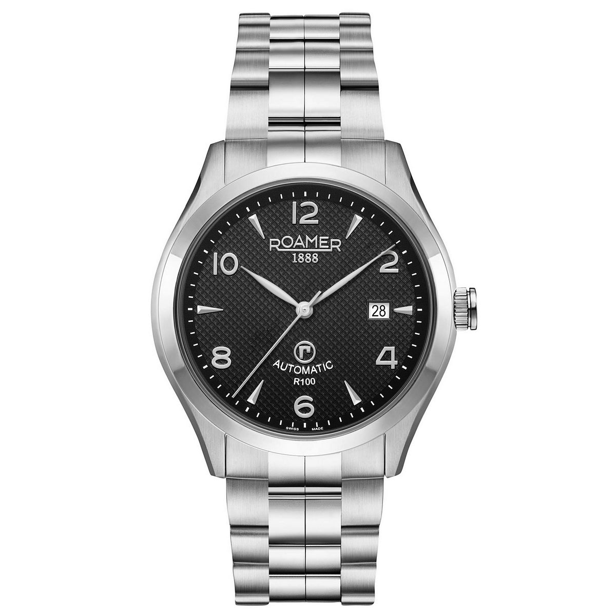 roamer r-100 automatic gents stainless steel black dial bracelet watch
