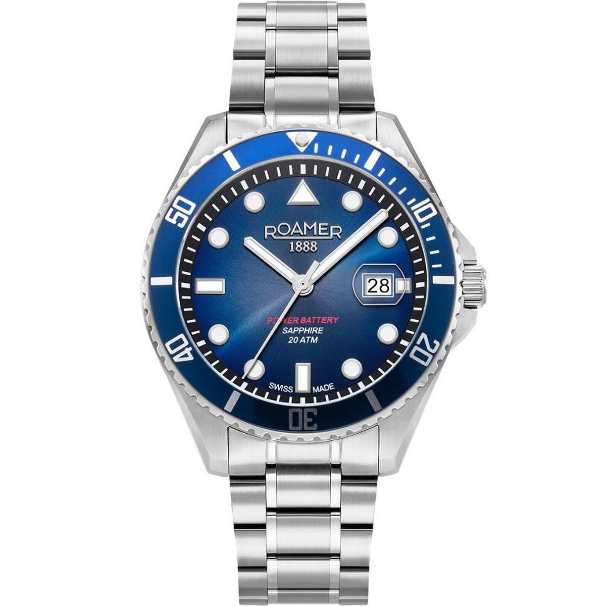 Roamer Pro Scuba 200 43mm Gents Special long life battery Watch Ronda Swiss Made 5030.D with exceptional battery life, which lasts an impressive 10 years. MOVEMENT TYPE: Quartz MOVEMENT CALIBRE: Ronda 5030D BAND TYPE: Stainless Steel Bracelet CLASP TYPE: Butterfly DIAL COLOUR: Blue WATER RESISTANCE (Metres): 200 CASE WIDTH: 43mm CASE DEPTH: 12.1 GLASS TYPE: Sapphire Crystal DATE FUNCTION: Date Only STONE TYPE: