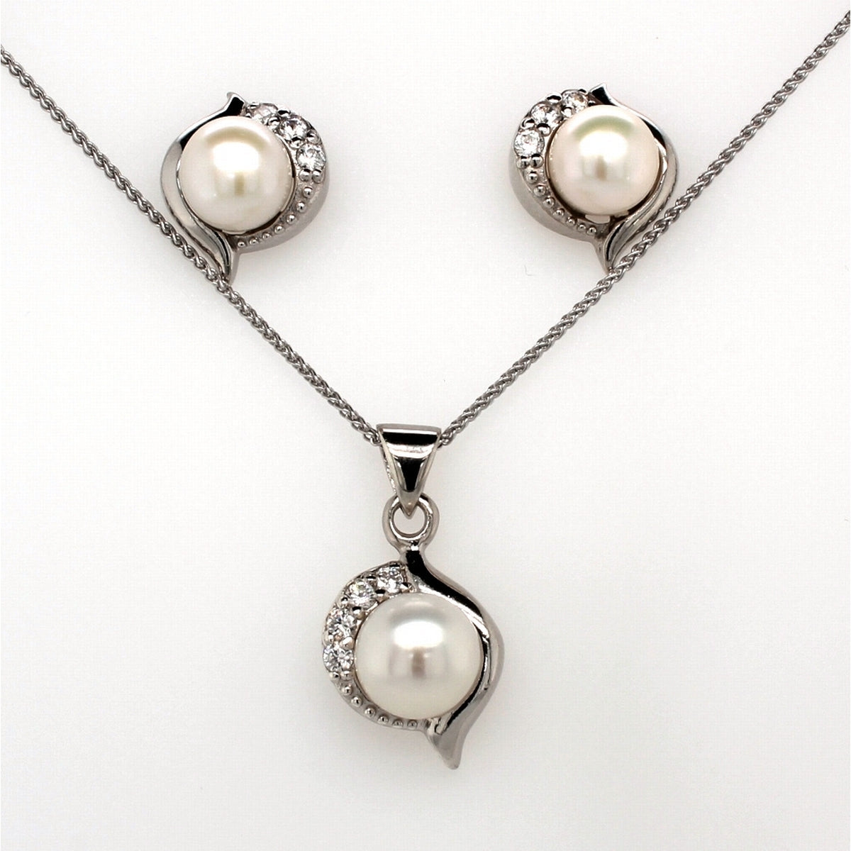 Silver Pearl And CZ Twist Stud Earring And Pendant Set 8mm