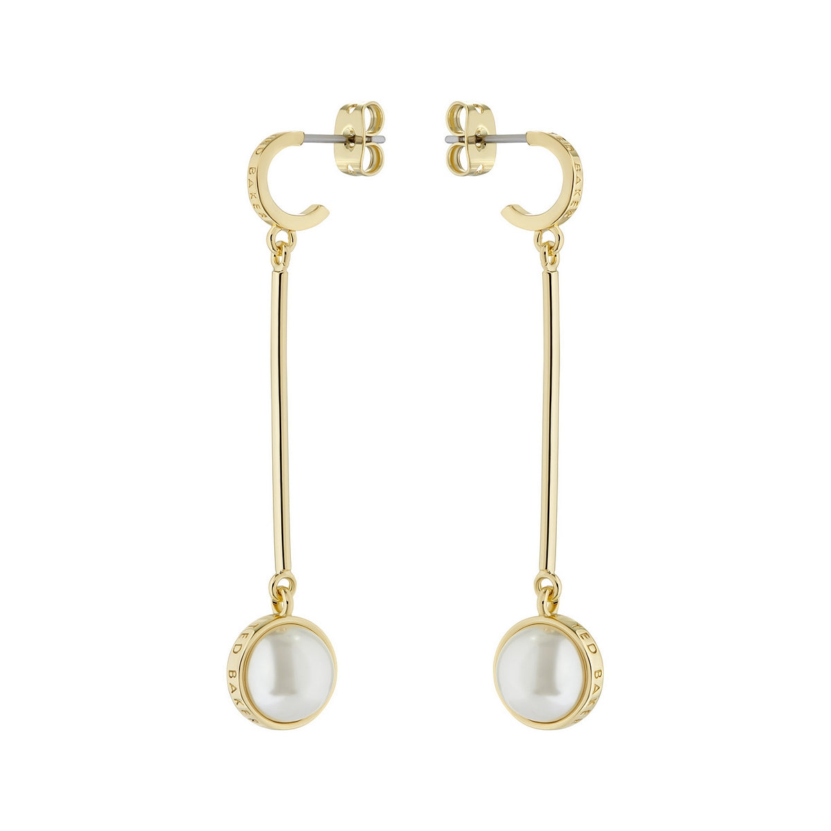 TED BAKER PERLLIE: Logo Pearl Gold Tone Long Drop Earrings 88% Brass, 10% Glass, 2% Stainless Steel, 100% Gold Tone Plating JEWELLERY TYPE: Earrings Drop METAL TYPE: PVD Plated Base Metal STONE TYPE: Pearl CLASP TYPE: JEWELLERY FAMILY: CHAIN LENGTH: