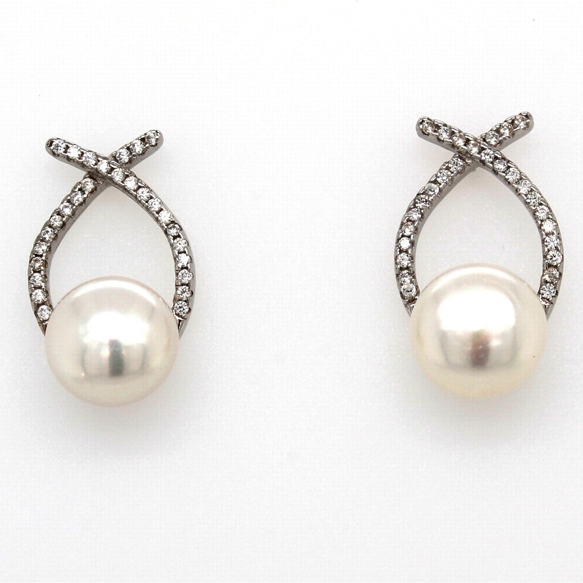 silver round pearl and cz wishbone stud�earrings 9.5mm