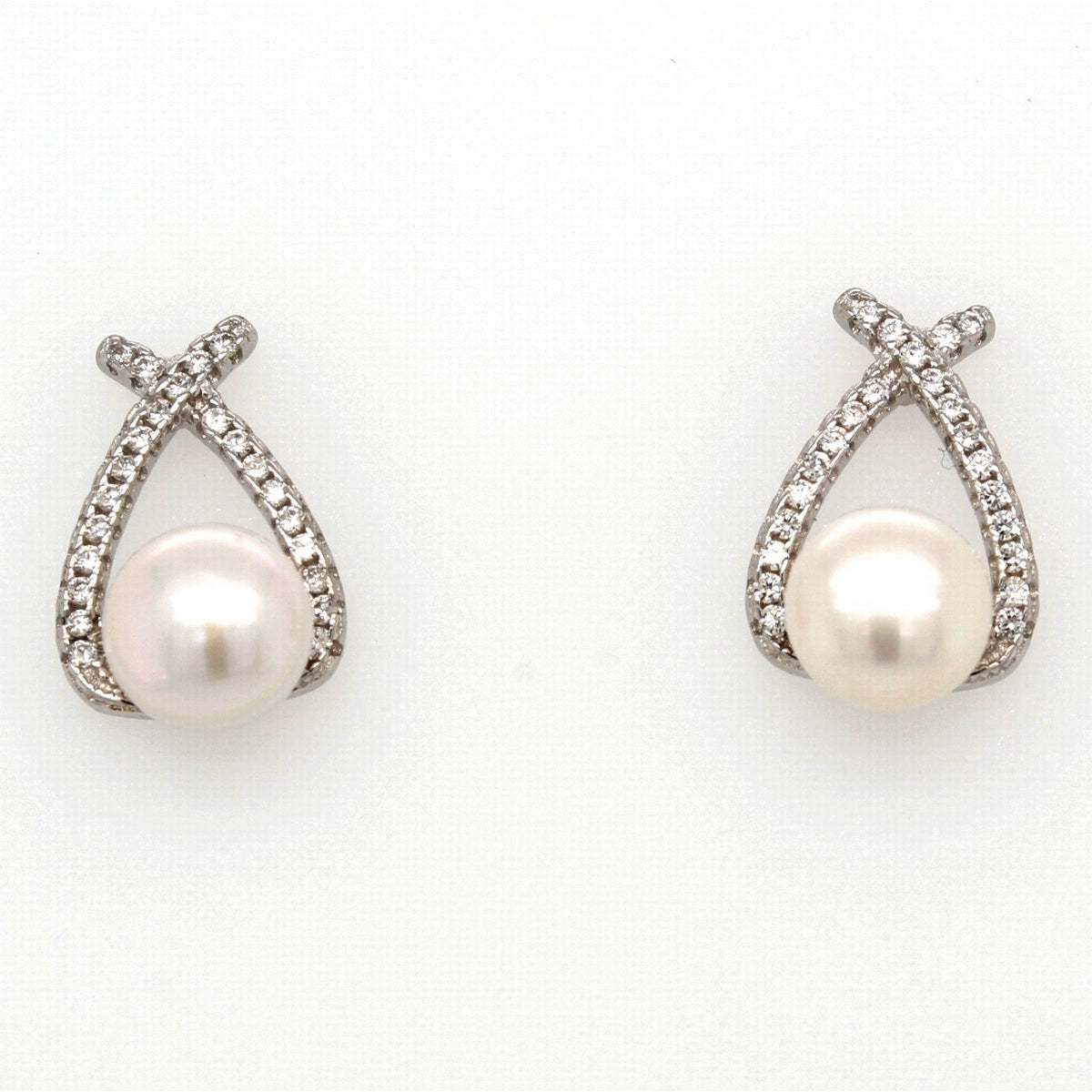 Silver Round Freshwater Pearl And CZ Wishbone Stud Earrings 7mm