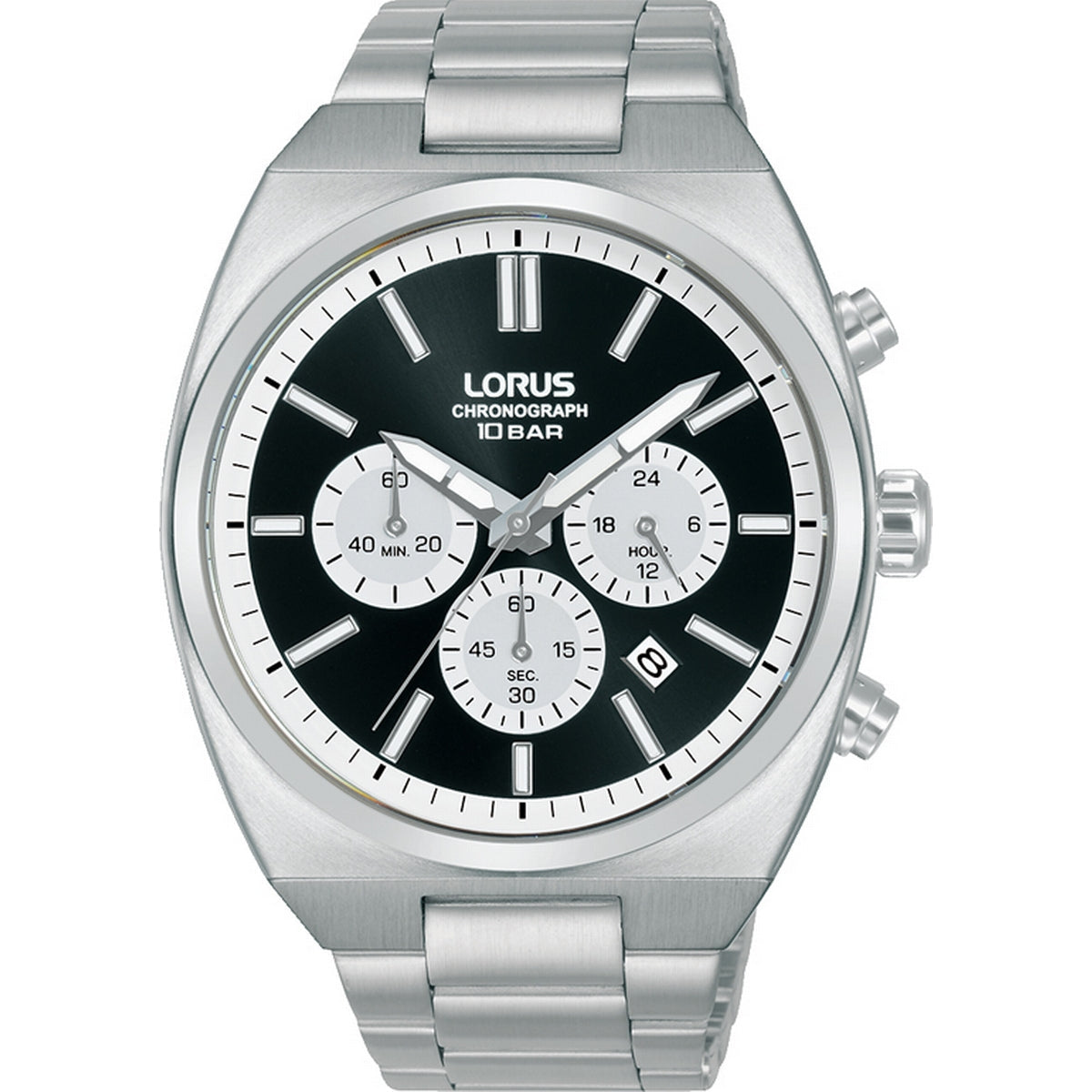 lorus quartz chronograph gents stainless steel black dial bracelet watch