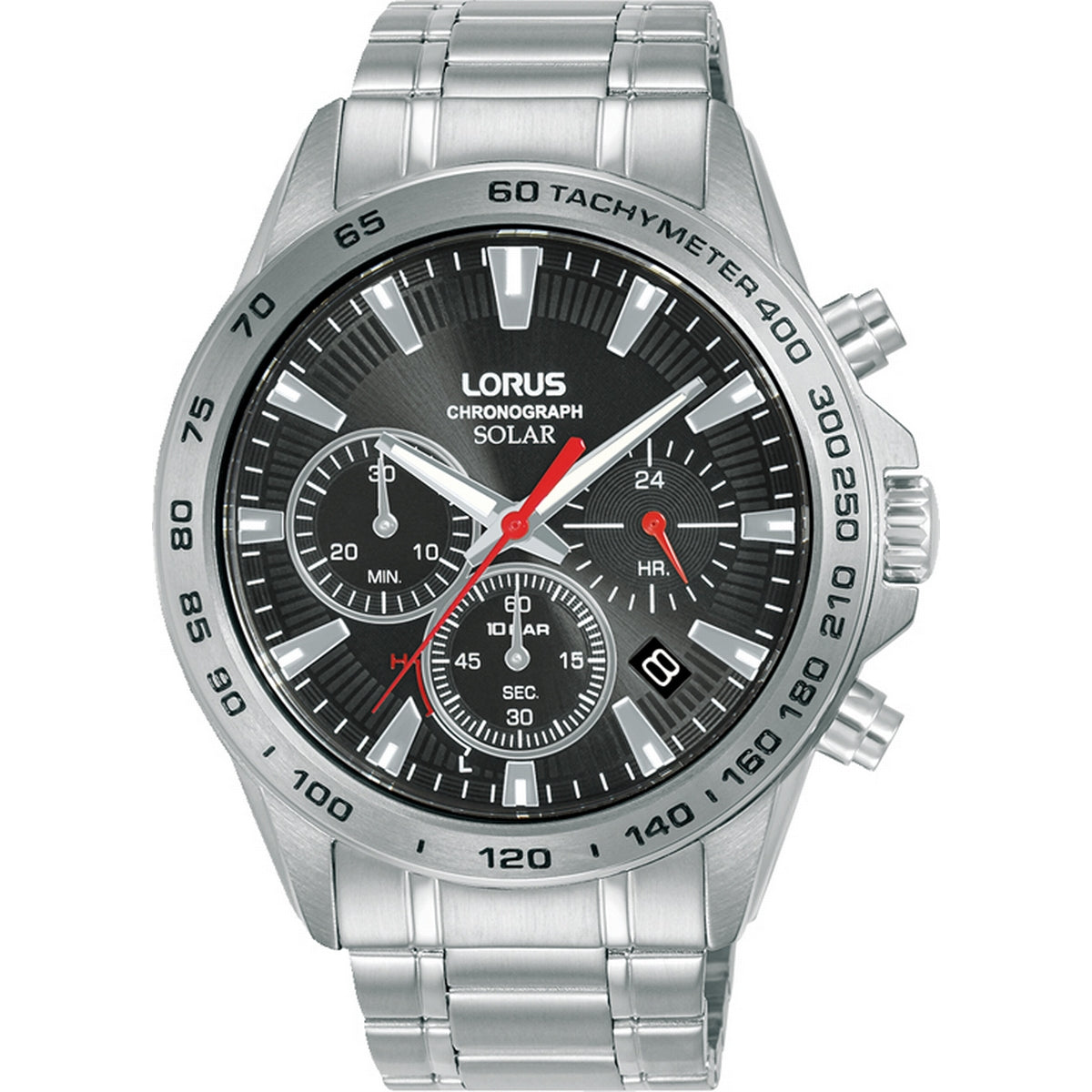 lorus solar chronograph gents stainless steel black dial bracelet watch