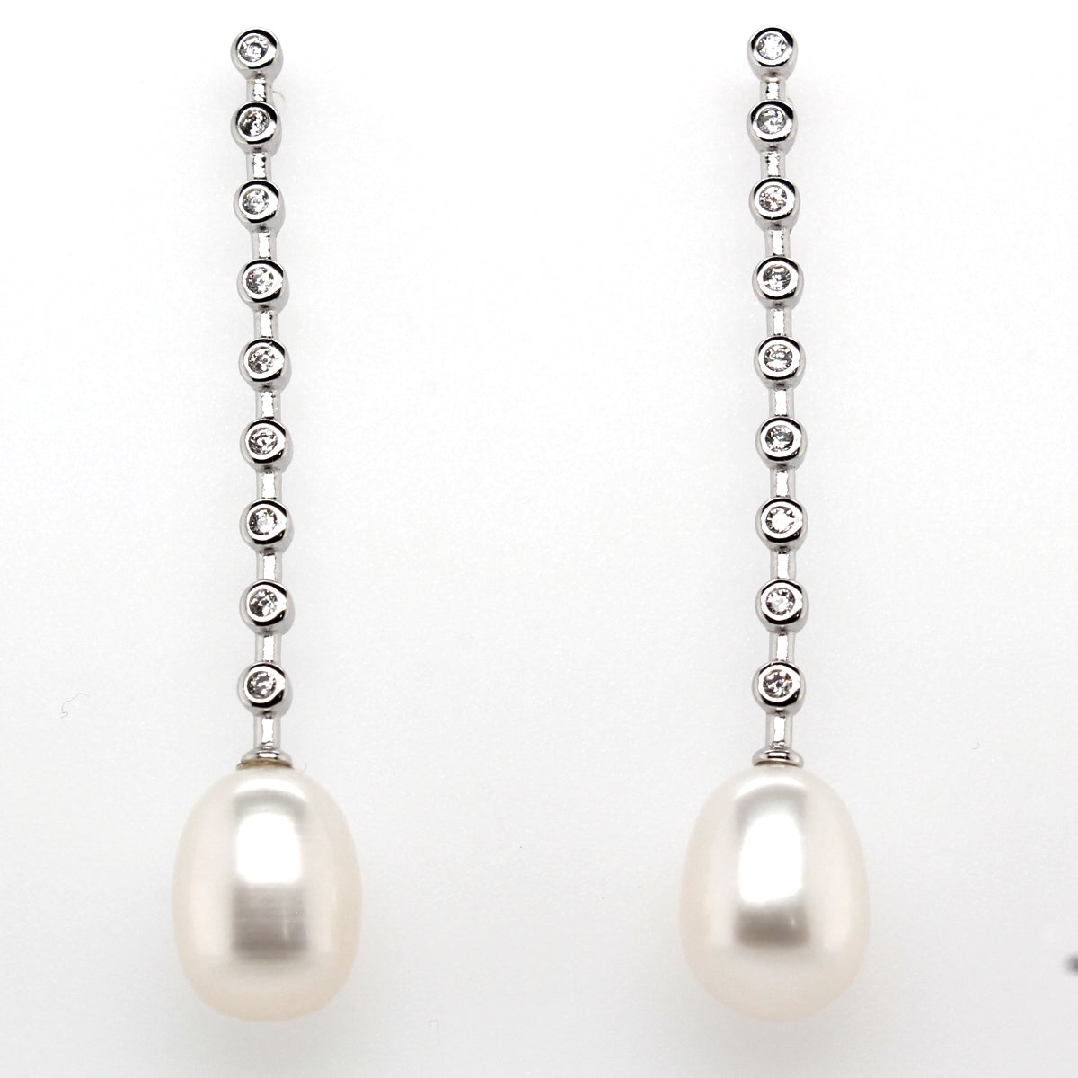 Silver Teardrop Freshwater Pearl and CZ Set Bar Drop Stud Earrings 9mm