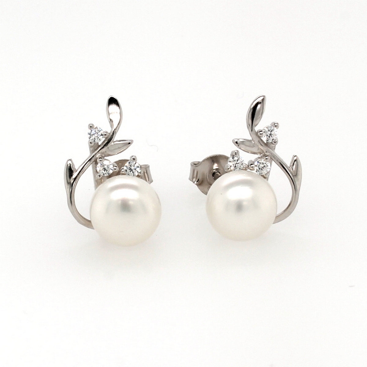 Silver Pearl and CZ Leaf Stud Earrings 7.5mm