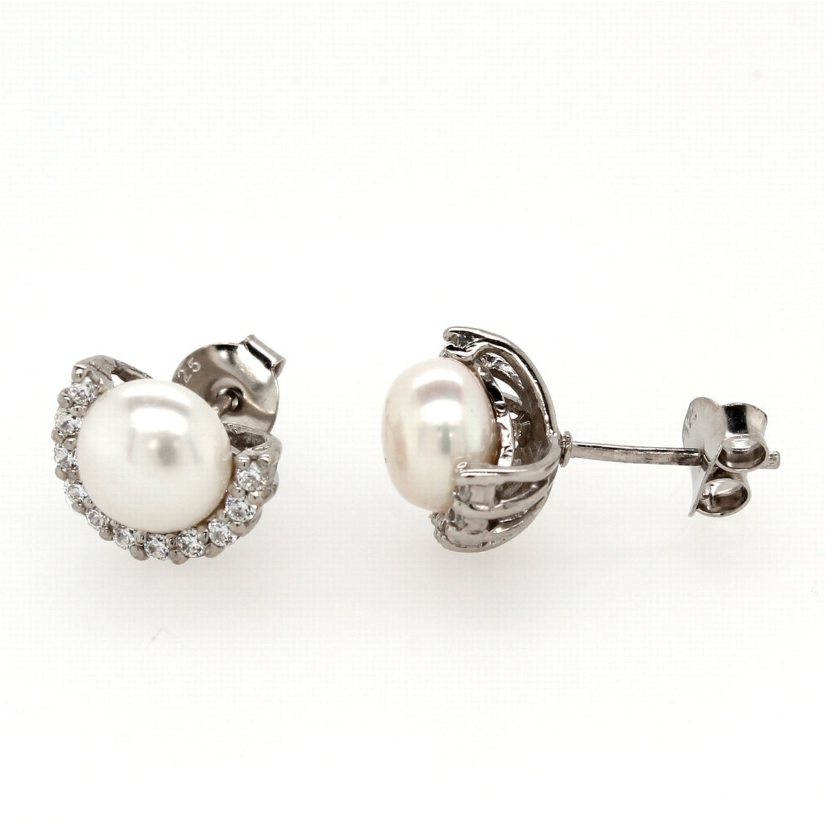 Silver Pearl And CZ Crescent Stud Earrings 8mm