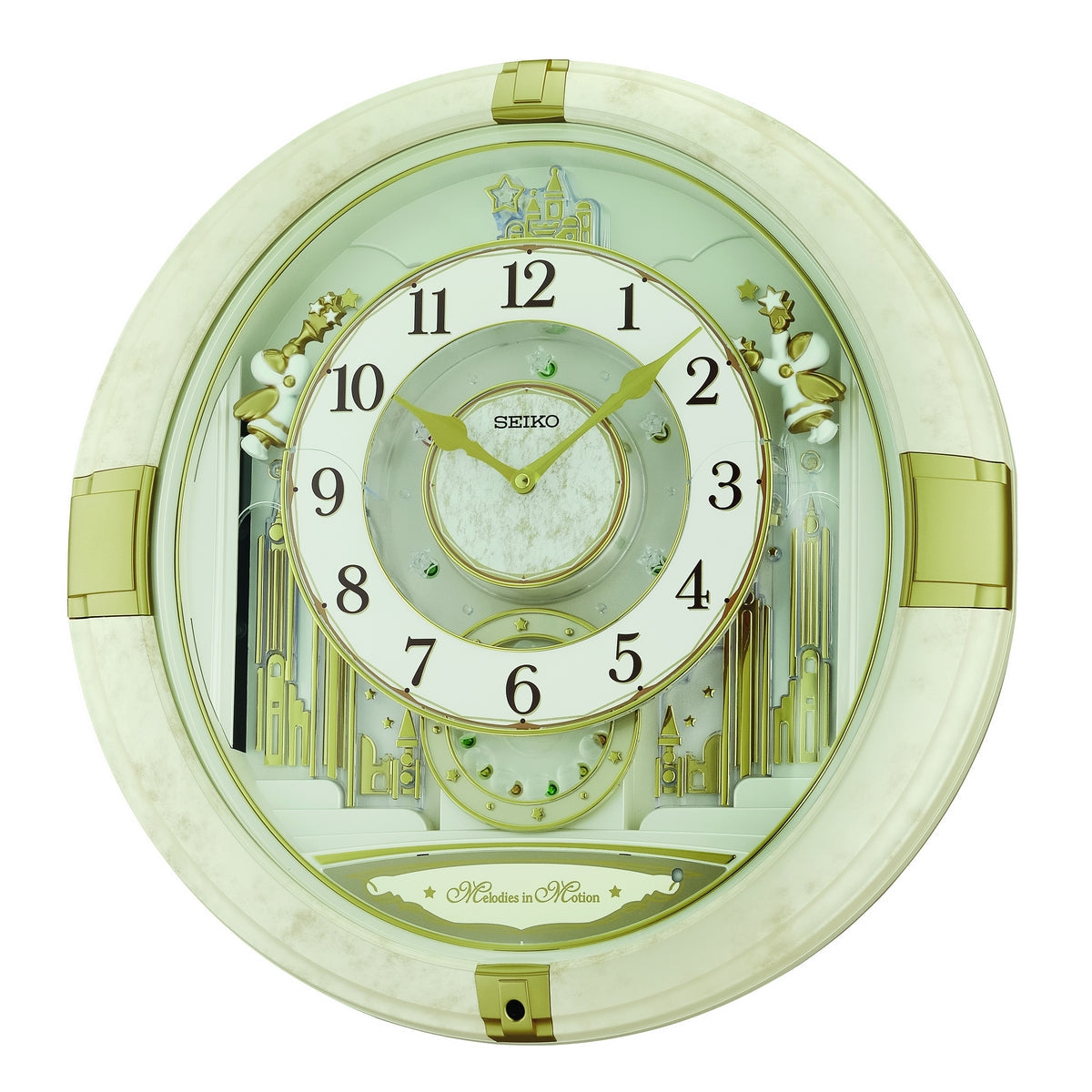 SEIKO MUSIC IN MELODY WALL CLOCK On the hour, clock plays a melody, 12 melodies/Westminister, light sensor, One-way rotating pendulum, White Marble colour, Volume control TYPE: Melody in Motion Clocks MOVEMENT TYPE: Quartz CASE WIDTH: 413mm CASE DEPTH: 128mm