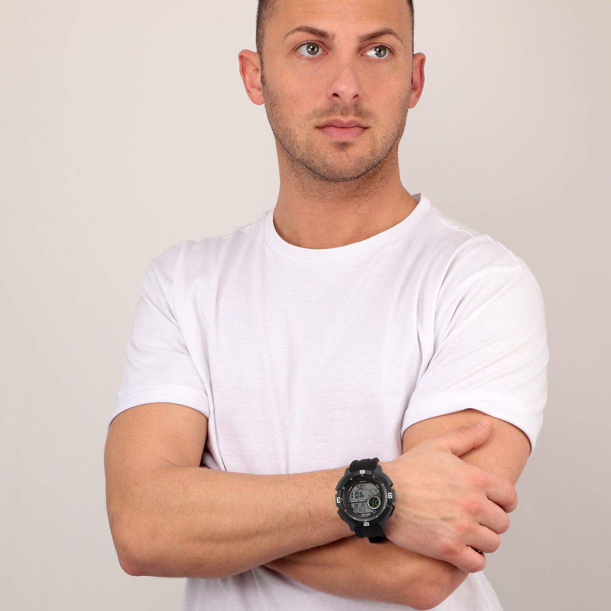 MOVEMENT TYPE: Quartz MOVEMENT CALIBRE: BAND TYPE: Silicone CLASP TYPE: DIAL COLOUR: Black WATER RESISTANCE (Metres): 50 CASE WIDTH: 54mm CASE DEPTH: 15mm GLASS TYPE: Acrylic DATE FUNCTION: STONE TYPE: