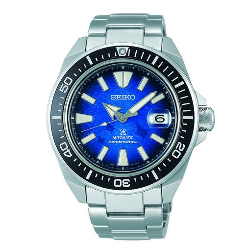 SEIKO PROSPEX "SAVE THE OCEAN" KING SAMURAI 43.8MM 200M WATER RESISTANT, BRACELET Screw case back Screw-down crown SPECIAL EDITION on the case back Three-fold clasp with secure lock Unidirectional rotating bezel MOVEMENT TYPE: Mechanical MOVEMENT CALIBRE: 4R35 -35/+45 seconds per day BAND TYPE: Stainless Steel Bracelet CLASP TYPE: Z-Clasp DIAL COLOUR: Blue WATER RESISTANCE (Metres): 200 CASE WIDTH: 43mm CASE DEPTH: 12.8mm GLASS TYPE: Sapphire Crystal DATE FUNCTION: Date Only STONE TYPE: