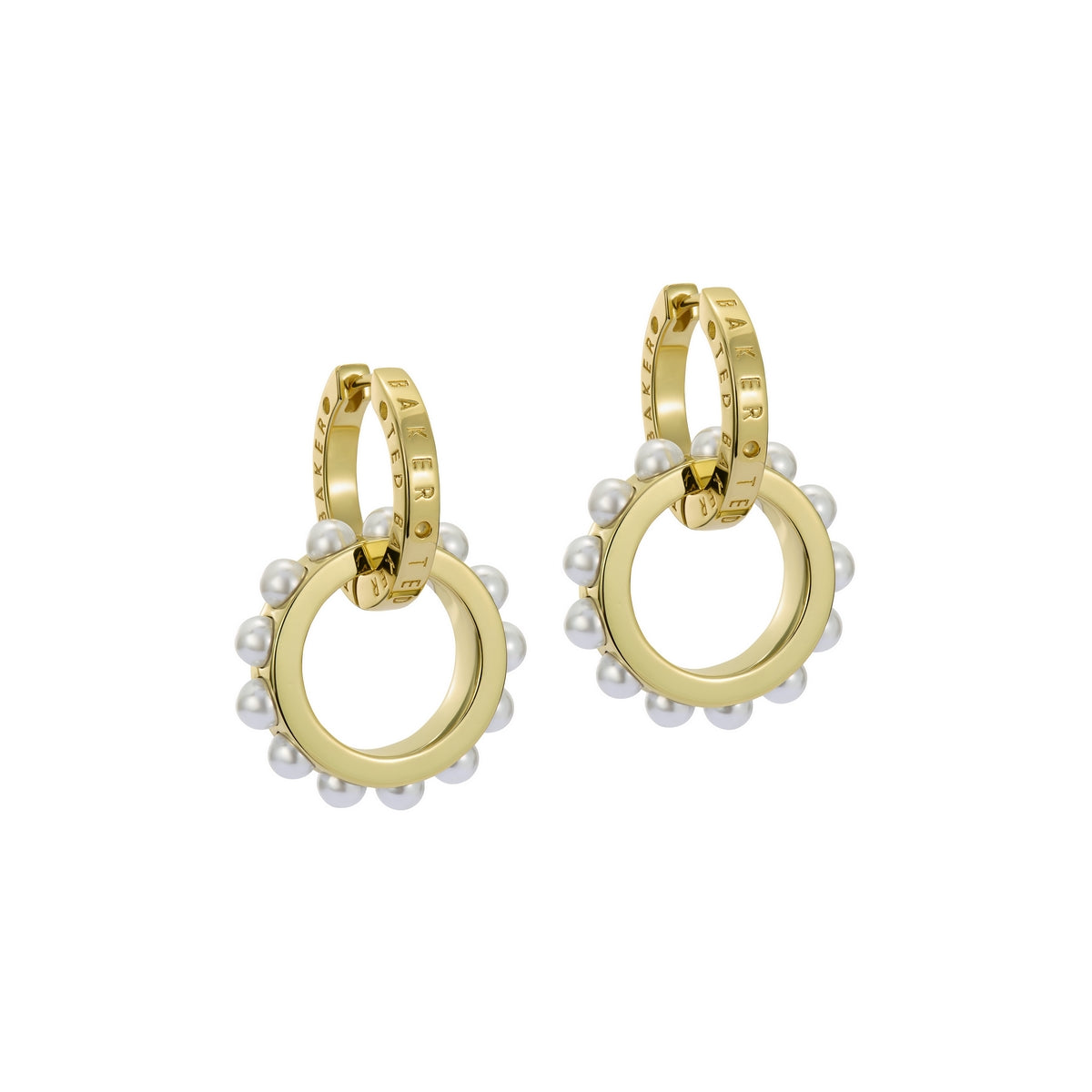 TED BAKER LORRIE: Double Logo Link Drop Earrings Gold Tone 85% Brass, 15% Glass Pearl, 100% Gold Tone Plating JEWELLERY TYPE: Earrings Drop METAL TYPE: PVD Plated Base Metal STONE TYPE: Pearl CLASP TYPE: JEWELLERY FAMILY: CHAIN LENGTH: